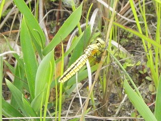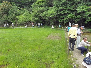湿地内ではモウセンゴケ関係で外来種が繁茂している、園芸店などでも簡単に購入する事が出来るが処分する時は注意をしていただくようにお話をしてから観察をおこなう。昨年は小雨とハッチョウトンボが少し早くて探すのにも苦労しましたが、今年は数も多く目が慣れてきた皆さんも沢山確認して感動してくれました。