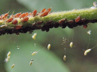 【左】ユミアシゴミムシダマシ 【中】24 狩人バチの巣? 【右】クサカゲロウの卵とアブラムシ