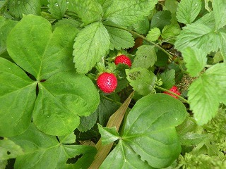 【左】ヘビイチゴ 【中】ヤマザクラのサクランボ 【右】スイカズラ(ニンドウ)