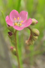 【左】たくさん開花したトウカイコモウセンゴケ 【中】トウカイコモウセンゴケの花とロゼット葉 【右】左、外来種のナガエモウセンゴケと右の在来種のモウセンゴケ