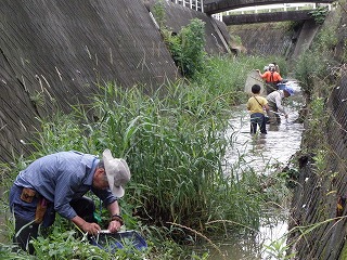 観察会開始の一時間前まで小雨が降っていたので実施できるか判断ができない状態でした。開始時刻になったら雨が止み、空が明るくなり始めました。川の水位も若干高い程度で子どもたちが活動しても安全な状態となりました。雨の影響か一般参加者の出足が鈍く、一家族3名でした。今回の観察会は、「あいちの自然観察会」と森税を活用した「あいち森と緑づくり環境活動学習推進交付金事業」が協力して行なうことになりました。「あいち森と緑づくり環境活動学習推進交付金事業」から川の生き物のリーフレットが渡されました。家族に一枚渡されるのが今回は参加者が少なかったため、参加者に一枚プレゼントされました。あいさつ、連絡、諸注意の後、早速、川に入り生き物採集を始めました。雨上がりしたばかりで、参加者が少ない中で参加した家族だけに川遊び大好きの人ばかりでした。今回の活動はすき者ばかりの集まりで要領よく生き物が採集できたみたいです。川は水量が多い上、濁っていましたがいつものようにたくさんの生きものを採集することが出来ました。最後に採集した生きものを種類別に集めどんなものが見られたかか確認をしました。観察後、最後に川に戻しました。