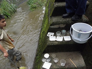 【左】ガサガサが始まりました 【右】最後にどんな生き物がいたか確認