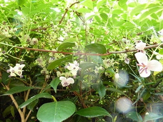 【左】観察しながら、ちゃっかり、山菜摘み 【右】アケビの花