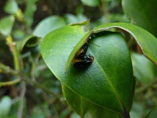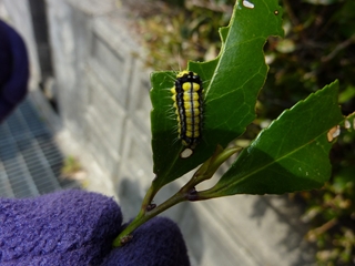 気持ちの良い春日和の中、阿久比エスペランス丸山駐車場で集合し、箭比神社までの道と箭比神社周辺を観察ししました。本日一般参加された女性の方が、幼虫飼育(特にチョウやガ)をされており、動・植物の観察に合わせて幼虫探しも行いました。唯一、見つけることができたのは、サカキの葉の上のホタルガの幼虫。その他、昆虫は、アリ、ナナホシテントウ、小さなバッタ、ハバチの仲間等を見ることができました。また、恒例となったキノボリトタテの巣もたくさん発見。