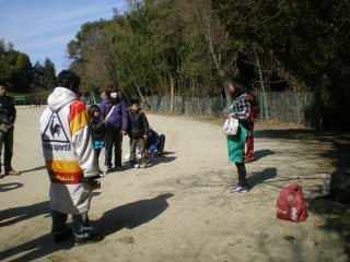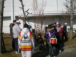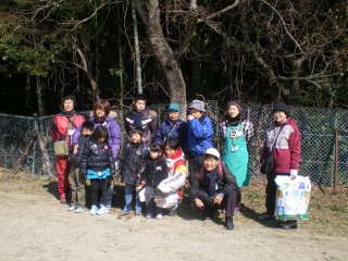 寒くはあっても風が弱くてこの時期としては良い条件の観察会でした。旭公園北駐車場に集合して歩いて大同グランドに向かいました。体育館の東側では春にまず咲くという意味から名付けられたといわれているマンサクの花をみんなで観察しました。花弁が赤い?(えび茶色かな)ものと黄色いものとの2種類がありました。木の根元の腐葉土を掘り起こしてみるとハサミムシやゴキブリなどがいました。今回は場所を少し変えてグランドの東南よりの竹の生えていないところで行いました。グランドの隅にシートをひろげて朽木を運び出し、各自持参のドライバーやかなづちなどで分解しました。まず最初に出てきたのはアオズムカデです。口々に、刺されると痛いよ、触っちゃいけないよの声が出る。ムカデの危険性は、皆さんがよくご存じで安心しました。ゴミムシ、ゴミムシダマシ、ハサミムシなどがみつかりました。子供たちの大好きなコクワガタの成虫と幼虫もみつかりました。すぐ近くのコナラの枝にはヤママユガのマユがぶら下がっていました。11時ごろ分解した朽木をみんなで林に返してから見つけたものを紹介し合いました。EXPOエコマネーセンターの三浦さんからエコマネーの説明があってポイントカードが配られました。記念の集合写真を撮ってから解散しました。(記 大野)