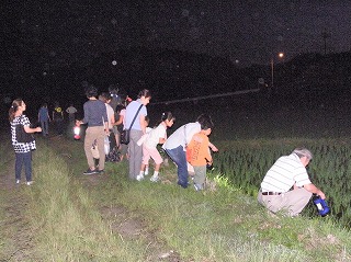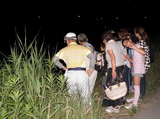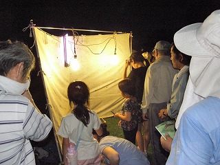 開会式で資料を使いホタルの生態について説明していただいた後、野外に出ました。野外は蒸し暑く風も少なく夜活動する生き物観察には好条件の日となりました。水銀灯の近くを通ると虫さんが集まってきました。ナイトハイクで毎年ヘイケボタルが発生する佐布里池下の水田に移動しました。現地では20頭くらい確認する事ができ参加した皆さんは大喜びでした。再び水銀灯の所に戻りました。たくさんの灯火に集まる虫を観察することが出来ました。(記・降幡)