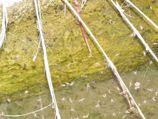 【左】ガガンボの結婚式         【中】池に張ったクモの巣にタクサンユスリカが付いていました。      【右】クモ