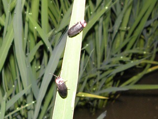 【左】セアカヒラタゴミムシ(知多半島ではよく見ます)    【中】恋愛中のヘイケボタル、上が小さいのでオス見たいです。     【右】ドウガネブイブイ