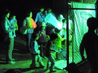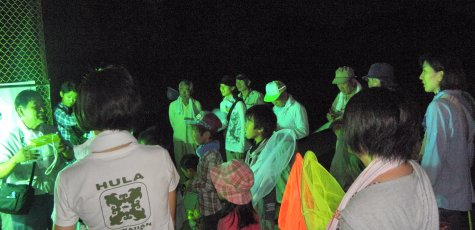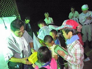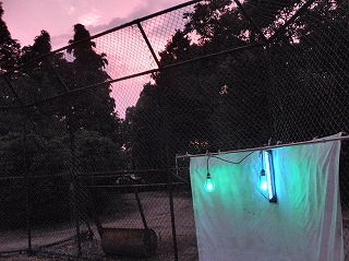 20時頃、旭公園東側に田圃と道路を隔てて広がる林へ移動する。道中、クロマドボタル幼虫の光に案内されて降幡さんと平松俊さんが待つ灯火採集の現場へ到着。子供たちは早速、捕まえてきた虫の名前や特徴について一人ひとり順番に平松俊さんから説明を受け、その後、灯火に集まった虫を観察した。