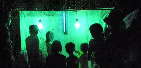 【左】水銀灯で虫を集めました。 【右】ナイトハイクで昆虫レストラン見学