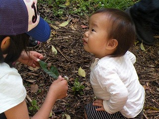 【左】森の中は暑くもなく、寒くもなく快適観察できた。 【右】カタツムリを子ども同士で観察している。