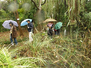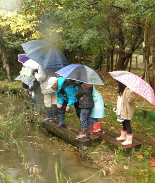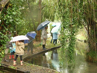 【左】雨の日は虫が少なかった 【右】ビオトープにコイがいたが疑問(コイは外来種)