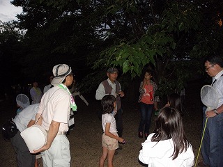 早々と梅雨に入った今年だが、ぐんと気温が上がって今日も真夏日。日が沈んでもまだまだ暑いし、空は明るい。主催者(地域文化センター)の挨拶と注意事項等の説明を受け、公園グランドを左に見ながら進む。どんぐり林に着く頃ようやく懐中電灯の出番となるが、大型のカブトムシの類は姿を見せない。