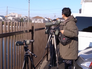 【左】康衛池 この日はカモの数が少なかったようです。  【右】りっぱな望遠鏡持参で参加してくれました。