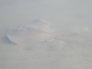 好天に恵まれ、まさに小春日和。風もなくじっくりゆったりとバードウォッチングを楽しむことができました。康衛池では、最も多いときで4羽のカワセミが池面近くを飛び交う様子、ハシビロガモが円陣を組んで頭を水中に突っ込んで泳ぎ回る様子、オオバンが首を前後に振って泳ぐ様子などが見られました。続いて阿久比川河口に移動。風が強いとここでの観察は辛いのですが、無風で陽射しはポカポカ、川面も波立つことなく穏やかという好条件で、のんびりと観察することができました。カモ類、サギ類などが見られました。珍しいお客さんとして水中をはばたくアカエイに出会えたのは幸運でした。そういえば今年は神戸川でアカエイの群泳が見られたそうです。