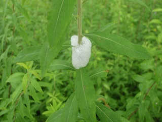 【左】アワフキムシの“すみか” 【中】同左の住民(住虫)…○○アワフキ 【右】サツキが満開