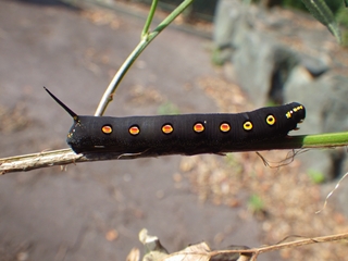 【左】セスジスズメの幼虫 【中】ジョロウグモ(♀)の間近にオス(♂)が2匹 【右】ガガイモの花と実