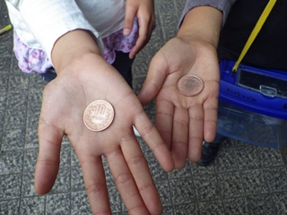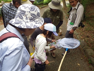 【左】子どもはくっつき虫をとっている 【中】10円玉ピカピカごっこ 【右】網からだしてアサギマダラを観る