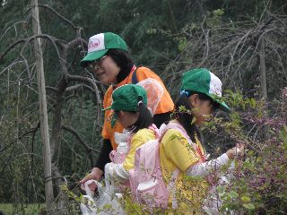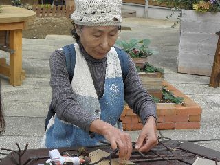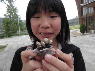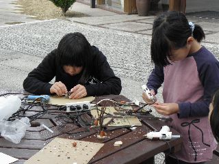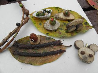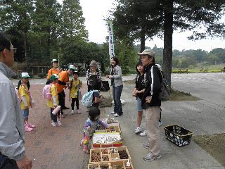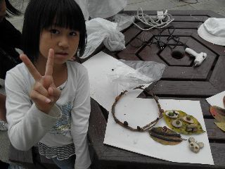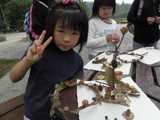 天気も心配されたので早めに木の実拾いは切り上げて工作をした。始めは見本のように作ろうとするのだが、だんだんオリジナルになって、どの作品も世界に一つだけのステキなものができあがった。子どもらは自由に発想を広げ楽しくかわいい作品がたくさんできた。あんまり夢中になって、帰るときになって「この作品どうやって持って帰ろう。」と、悩む姿が見られた。 (記・竹内秀 )
