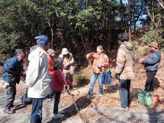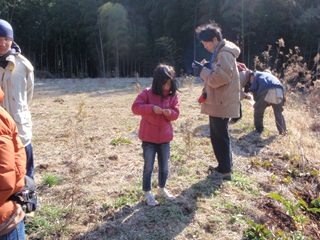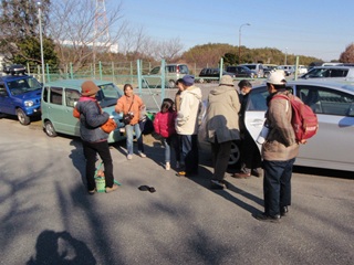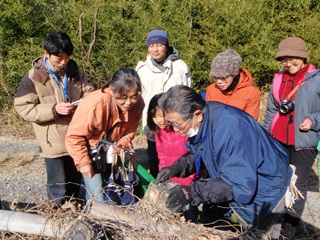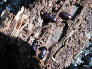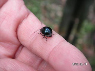 石浜西小学前に集合して、少人数だったので、わいわいがやがやと学校の南側を西のほうに向かって歩いた。道の両脇の木々が切られ、竹がますます目立つようになっていた。林の中では、ヤブコウジ、マンリョウ、ジャノヒゲが実をつけていた。朽木の中には、お決まりの虫達が、成虫のまま、あるいは幼虫の形で冬を越していた。晴れていたので、日影と風があたる場所は寒かったが、陽だまりには、成虫で冬を越す甲虫が見られた。(記・岩本 )