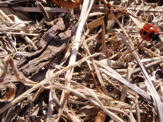 【左】この草原に昆虫が動いてました 【中】ハムシの仲間…この時期のメスは腹がふくれている 【右】ナナホシテントウ