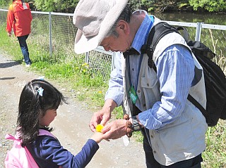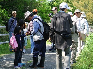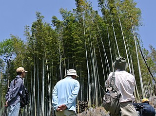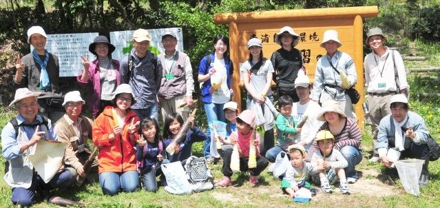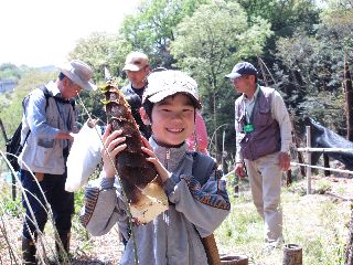 3家族に指導員の家族も含めていつもよりにぎやかな観察会となった。始めのうちはカメやチョウ、野花をみながらゆっくりスタート。トンボの姿も見えた。よもぎだんごやイタドリジャムのつくりかたにお母さん達の話に花が咲いた。キノコに歓声を上げたり、ワラビをとったりしながら、細長い森の半ばまできたところで水場を藪こぎしながら横切って竹林へ。思い思いに掘りとって、今夜のおかずようにとリュックに入れた。竹の皮の利用のしかたを話したり掘り方の話をしたりしながら竹林をめぐり終わって東屋で写真を撮った。(記・竹内秀)