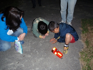 【上2枚】近くにきたホタルが地面に止まると子どもたちは観察…まったく飽きる様子なしで…