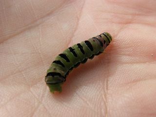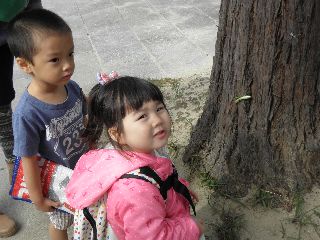 【左】きれいな芋虫、寒くで動きが鈍いです。    【右】何を見つけたのかな。