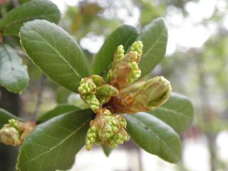 【左】ウバメガシの新芽と雄花芽生え 【中】カヤの木 大きいです 【右】桜にもみえる?神後院つばき