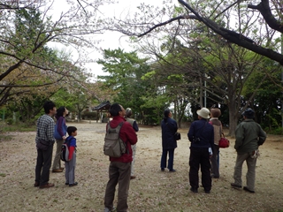 雨が降り出す心配と爆弾低気圧による風の中、生路公民館に集合して神社を回り、社寺林や住宅街樹木の観察をしました。