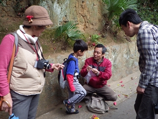 まずは、生路公民館から、天満宮へ、そして伊久智神社へ向かいました。ソメイヨシノはかなり散り始めていました。境内には、イチョウ(雄花)、エノキの花が見られ、ヤブツバキの花が見ごろでした。そのほかカヤ、クスノキ、シイ、カシなど、大木がありました。続いて神後院には閻魔大王の石像(下段の写真参照)があり、水を掛けると今までのウソを水に流してもらえるとか・・・大きなカゴノキの木があり、また、とても清楚なツバキが咲いていました。観音寺では今にも咲きそうなボタン、フリージア、ムスカリの花があった。観音寺を出て公民館に戻る道沿いの蔵の石基礎の隙間を出入りしている日本ミツバチを見つけた。