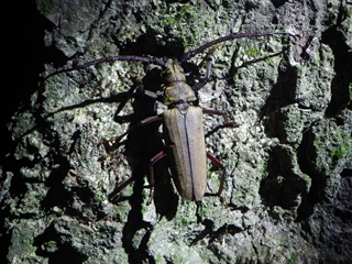 ここでは以前アブラゼミの羽化を良く見た。今年はアブラゼミはわずかだ。減ってしまったのか、羽化が遅れているのか、どちらだろう。灯火採集は駐車場からすこし林に入ったところに準備をしていただいた。ニイニイゼミ、カブトムシ、カミキリムシ、コガネムシやガ仲間を観察することができた。 (春日、岩本記)