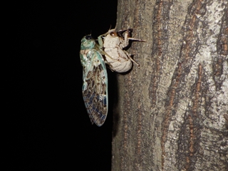 【左】ニイニイゼミの羽化 【右】ナイトハイクを終えてから灯火に集まる虫さんの観察