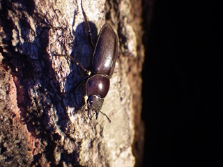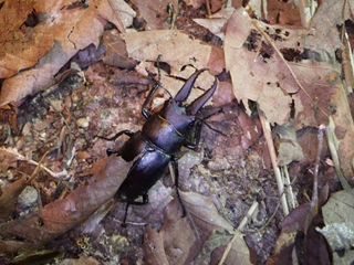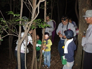 最近雨が降っていないので、林は乾燥気味でした。期待薄かと思いつつ、虫を探して林の中へ。ニイニイゼミの抜け殻、ニイニイゼミの羽化しようとしている幼虫を見つけながら進んだ。ニイニイゼミの抜け殻は数十センチの高さに本当に多数見られた。アブラゼミの抜け殻はわずかであった。さほど樹液が出ていないように見えるコナラでコクワガタの雄、雌を見つけて、みんなが元気になった。やはり、クワガタやカブトムシがターゲットのようだ。カナブンが多数いるコナラ、羽化直後のニイニイゼミ、羽化直後のニイニイゼミを食べているムカデなどいろいろ見ることができた。そして終わり掛けに、カブトムシが6,7ひきも張り付いている木を見つけた。カブトムシやクワガタが採れて子供達は満足だった。やはり、虫取りは楽しい。