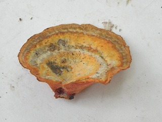 【左】少ない 今年の採集成果 【中】アオゾメタケ 【右】カワラタケ