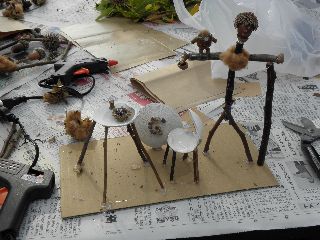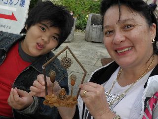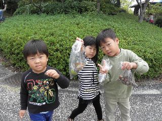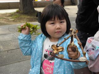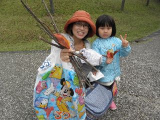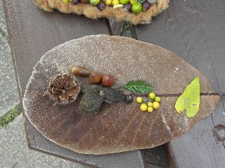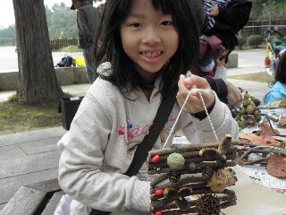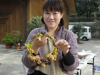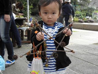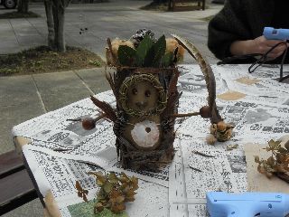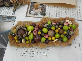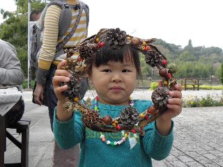 三連休の後半は雨の予報で、今日2日は雨は大丈夫という曇空。風もなく外で工作の用意をした。ところが、5分前になっても参加者は5人ほど。公園には紅葉めあてに散歩するシルバーや親子連れがちらほら。どうなることかと気をもんだが、会を始め実を拾うため30分ほど公園を軽く回って帰ってくる頃には24人の参加者となり、園内放送も入れずにすんだ。男の方で植物のことが知りたいと参加された方や、先週健康の森での参加者で名古屋からの参加もあった。アラカシのまだ青さも残る実が拾え、コナラ、クヌギとドングリロードを通る。子どもならず大人までもが歓声を上げて拾う。クヌギは未成熟果が多いように思われた。小さい子が多かったので、ハクウンボクの方へは行かなかった。3年連続で、参加された親子連れもいたり、工作の様子を見て工作だけ参加という親子や、終わりごろに参加したいのだがと来られ作っている親子もいた。 今年の工作も見本無しでスタート。はじめからオリジナルで、どの作品も世界に一つだけのステキなものができあがった。子どもの年齢が小さかったが、大人顔負けの作品を作る子もいた。大人は、クリスマスを意識して楽しんでステキな作品を作っていた。 (記・竹内秀 )