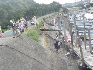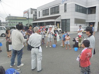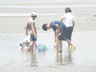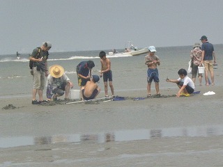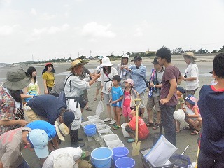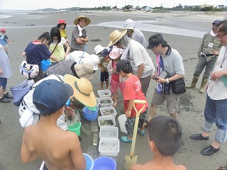 朝から好天に恵まれたこともあり、多くのみなさんの参加があって盛況な観察会となった。内容は昨年と同様に、山王川河口で干潟の貝やカニの観察、奥田海岸で砂浜の生き物の観察を行った。干潟の貝やカニとしては、ウミニナ、ヘナタリ、フトヘナタリ、オキシジミ、チゴガニ、コメツキガニ、ヤマトオサガニ、タカノケフサイソガニなどを観察したが、森田指導員の話によるとチゴガニやコメツキガニが今年は減ってしまったそうで、ウエービングの様子はあまり観察することができなかった。一方砂浜では、シオフキやマテガイが砂に潜る様子や、マメコブシガニが縦に歩く様子などを観察した。今年は夏になって早々に台風の接近もあって、その影響からか普段よりあまり生き物が見られなかったが、参加された家族は海の生き物に触れ、楽しい経験ができたと思う。なお、観察会前の集合時には、永田が自宅のシマトネリコから採集したカブトムシの配布も行い、子どもたちに好評であった。(記:永田)
