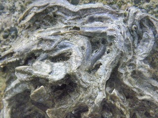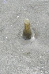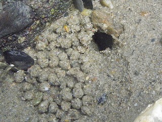 【左】コメツキガニの砂球 【中】外来のフジツボ? 【右】ヨコバサミの仲間