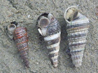 【左】左からヘナタリ、ウミニナ、フトヘナタリ? 【中】タマキビとアラレタマキビ(小さく青白い) 【右】スガイ