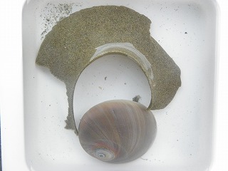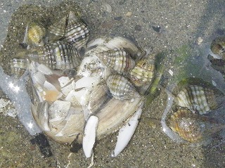【左】イボニシと卵 【中】ツメタガイの卵(上)とツメタガイの貝殻 【右】死体に群がるアラムシロガイ