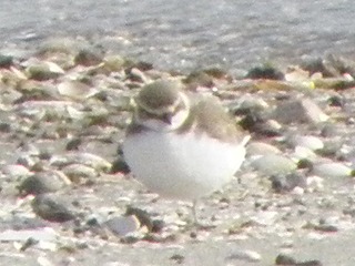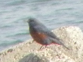 海に伸びた消波ブロックの突堤。一番高い尖ったところにイソヒヨドリが・・一斉にレンズを向ける。「きれい、きれい」と感嘆の声。波打ち際の小石混じりのところにシロチドリが静かに羽根を休めている。