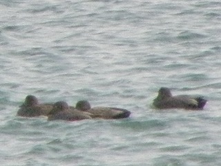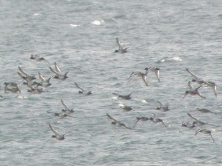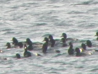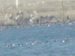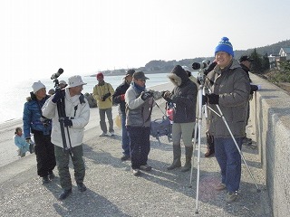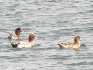 海岸線が丁度弧を描いているところの海面を見ると、カモがいっぱい集まっている。皆サッと双眼鏡で見る。ヒドリガモとスズガモだ。