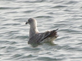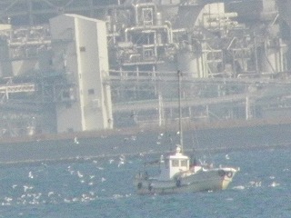 沖で漁船が網を引いているらしい。その漁船の後ろをおびただしい数のオオセグロカモメが、長い帯状となって飛び交いながらついていっている。