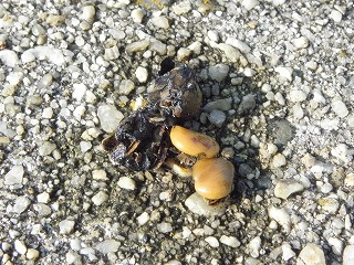 後半、小さいお子さん達は砂浜に下りて貝を拾いながら進んだ。布土川河口の先、角だて網の沖にカワアイサを見て折り返した。