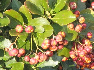【左】ヒヨドリの糞、ハゼの種子 【右】鳥のご馳走になるマサキ