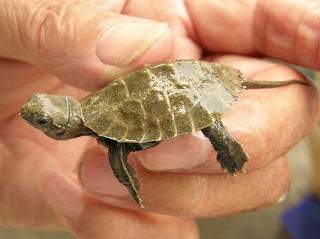 【左】アカミミガメ 【中】イシガメの赤ちゃん 【右】イシマキガイ