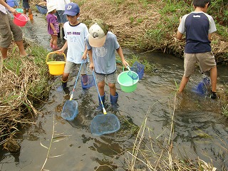 【左】みんな協力して生きものを探します 【右】さっそく、タモを入れました