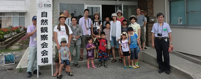 【左】公民館の前で記念撮影 【右】どんな生き物がいたか説明