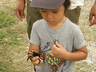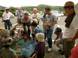 採取した生物の確認の際、ザリガニの雌雄の見分け方、アユの匂いなど、観察指導員による解説に、参加の親子連れも興味深く聴き入っていた。