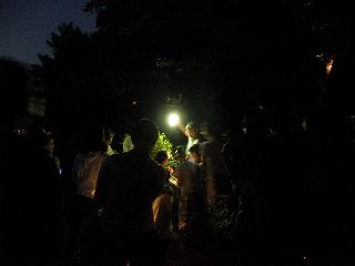「これ虫?」という指の先にはゲジゲジ、ムカデ。虫ではないものもちゃんと森の中で役目があることを観察し、むししないようにという話も。所々に樹液の流れる木もあり、お目当てのクワガタも5頭いた。捕まえたお母さんの「いたー!」の声やクワガタジャンケン大会の声でにぎやかな声が森にひびいた。志学館大の夜間照明が今年からまぶしく、虫の動きに影響があるように感じられた。いつもカブトムシが集まる木には光が当たり虫の気配が見られなかった。カブトムシは今年はゼロ。燈火採集の光の下にはアオカナブンがたくさん集まっていた。